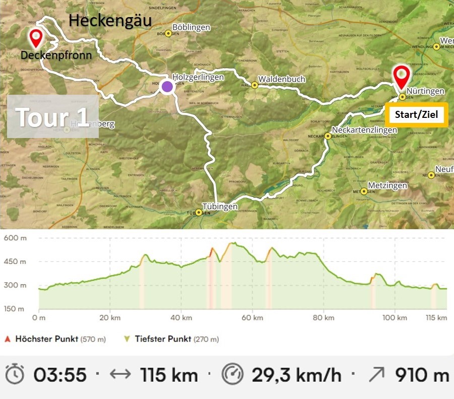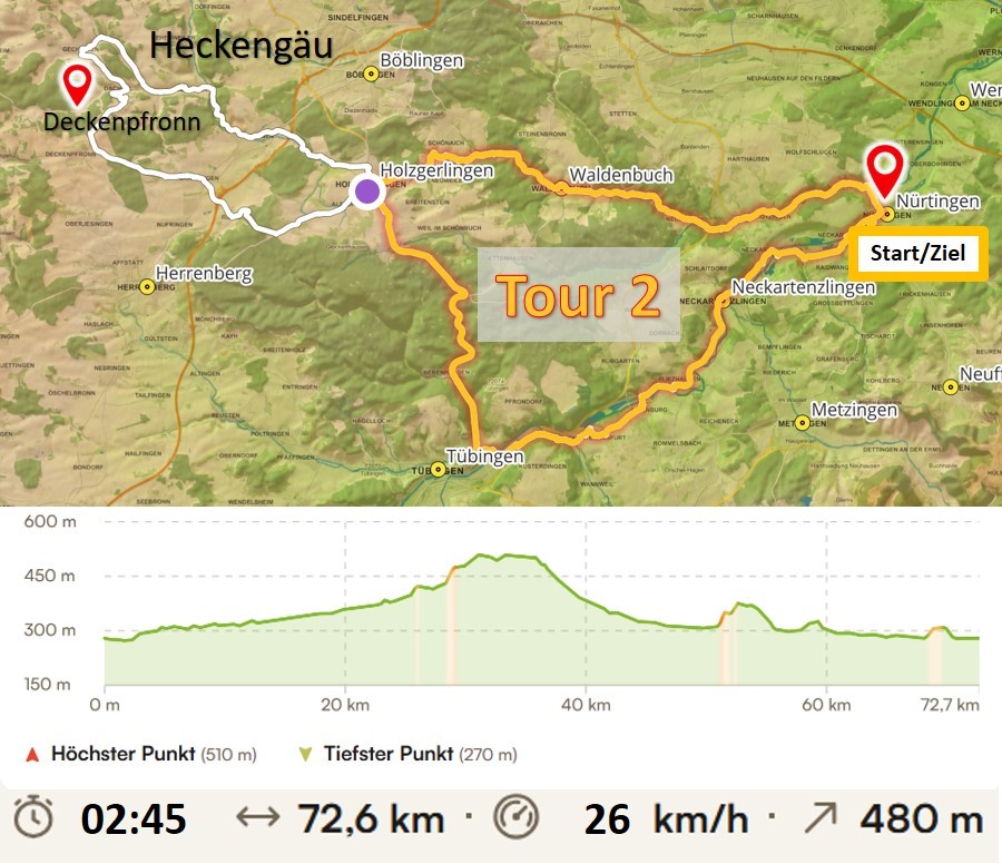 Von Nürtingen aus geht es zunächst zusammen mit Tour 1 in einem gemeinsamen Tempo bis Holzgerlingen, sodass alle mitkommen. Ab dort geht es dann auf die Route der Tour 2 in Richtung Tübingen und am Neckar entlang zurück nach Nürtingen.