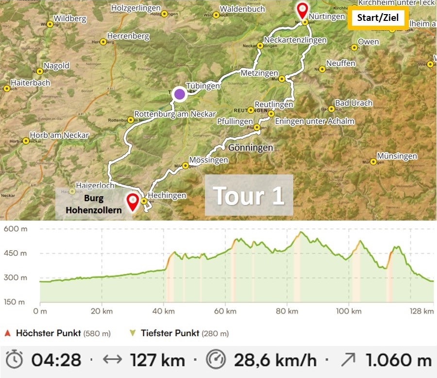 Die Route führt am Neckar entlang über Rottenburg nach Hechingen mit schönem Blick zur Burg Hohenzollern. Über hügeliges Terrain am Fuße der Schwäbischen Alb geht es dann über Pfullingen wieder zurück nach Nürtingen.
