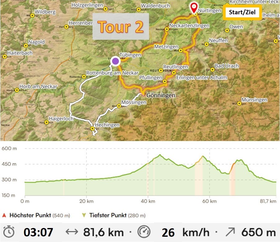 Von Nürtingen aus geht es zunächst zusammen mit Tour 1 in einem gemeinsamen Tempo bis Tübingen, sodass alle mitkommen. Ab dort geht es dann auf die Route der Tour 2 in Richtung Gönningen und nach Nürtingen zurück.