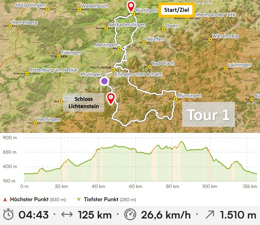 Die Route führt uns über die Honauer Steige am Schloss Lichtenstein vorbei auf die Schwäbische Alb. Über die Albhochfläche mit schönem Weitblick und über Münsingen geht es dann wieder zurück nach Nürtingen.