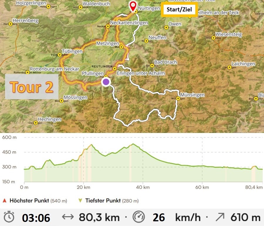 Von Nürtingen aus geht es zunächst zusammen mit Tour 1 in einem gemeinsamen Tempo bis Pfullingen, sodass alle mitkommen. Ab dort geht es dann auf die Route der Tour 2 in Richtung Tübingen und am Neckar entlang nach Nürtingen zurück.