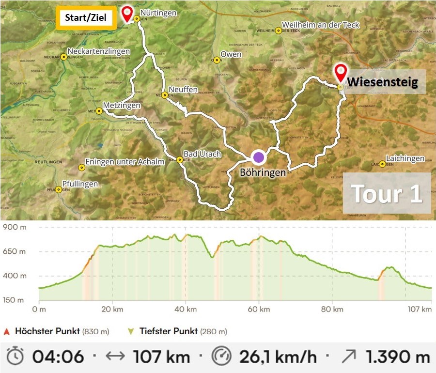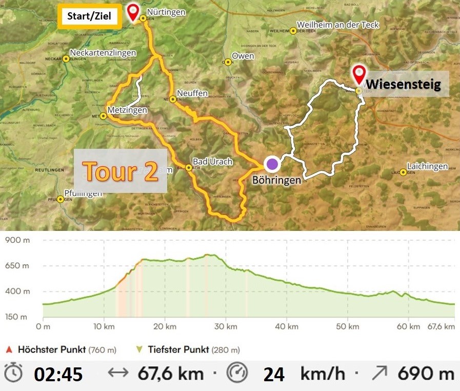 Von Nürtingen aus geht es zunächst zusammen mit Tour 1 in einem gemeinsamen Tempo bis Böhringen, sodass alle mitkommen. Ab dort geht es dann auf die Route der Tour 2 in Richtung Bad Urach und nach Nürtingen zurück.